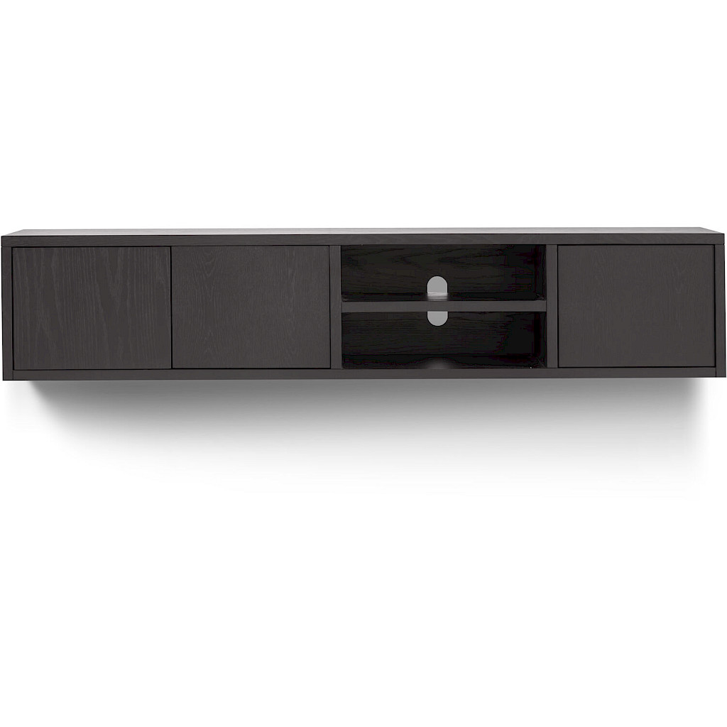 De kastenserie van Nerano is strak en tijdloos. Dit TV-meubel is uitgevoerd in eiken fineer in de kleur nero en heeft 3 deuren en 2 open vakken. De eiken ombouw is gelakt, waardoor deze vriendelijk in onderhoud is.