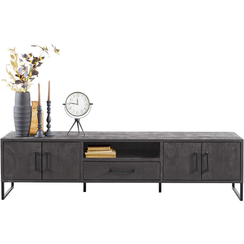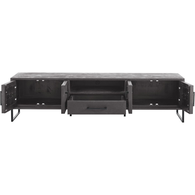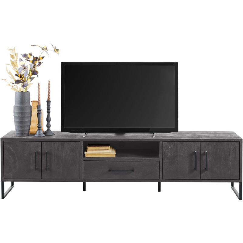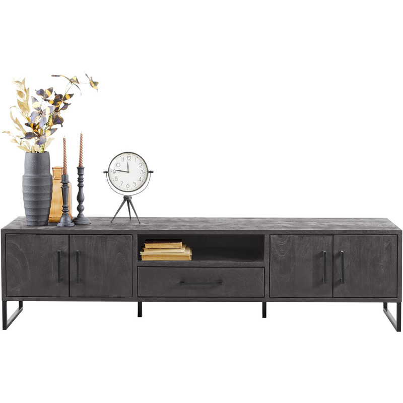 Transformeer jouw woonruimte met ons tv-meubel Piastra, vervaardigd uit zwart mangohout (gezandstraald) in perfecte harmonie met een elegant metalen frame. Het mangohout, bekend om zijn duurzaamheid en warme tinten, voegt een natuurlijk element toe aan je ruimte terwijl het metalen frame een eigentijdse uitstraling geeft. Door het mangohout zwart te kleuren voeg je een krachtig design element toe. De houtnerven en nuances maken elk meubel uniek en dragen bij aan een karaktervolle uitstraling.
