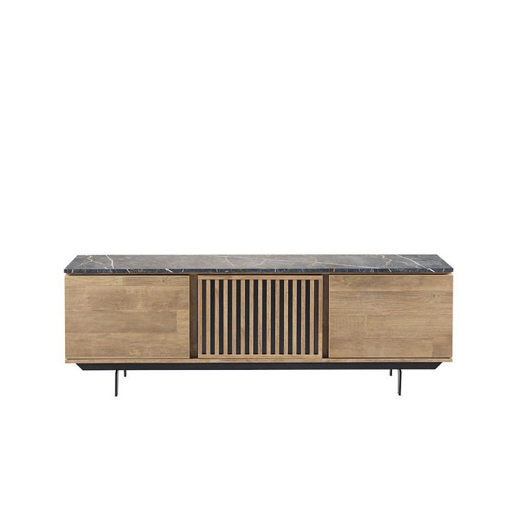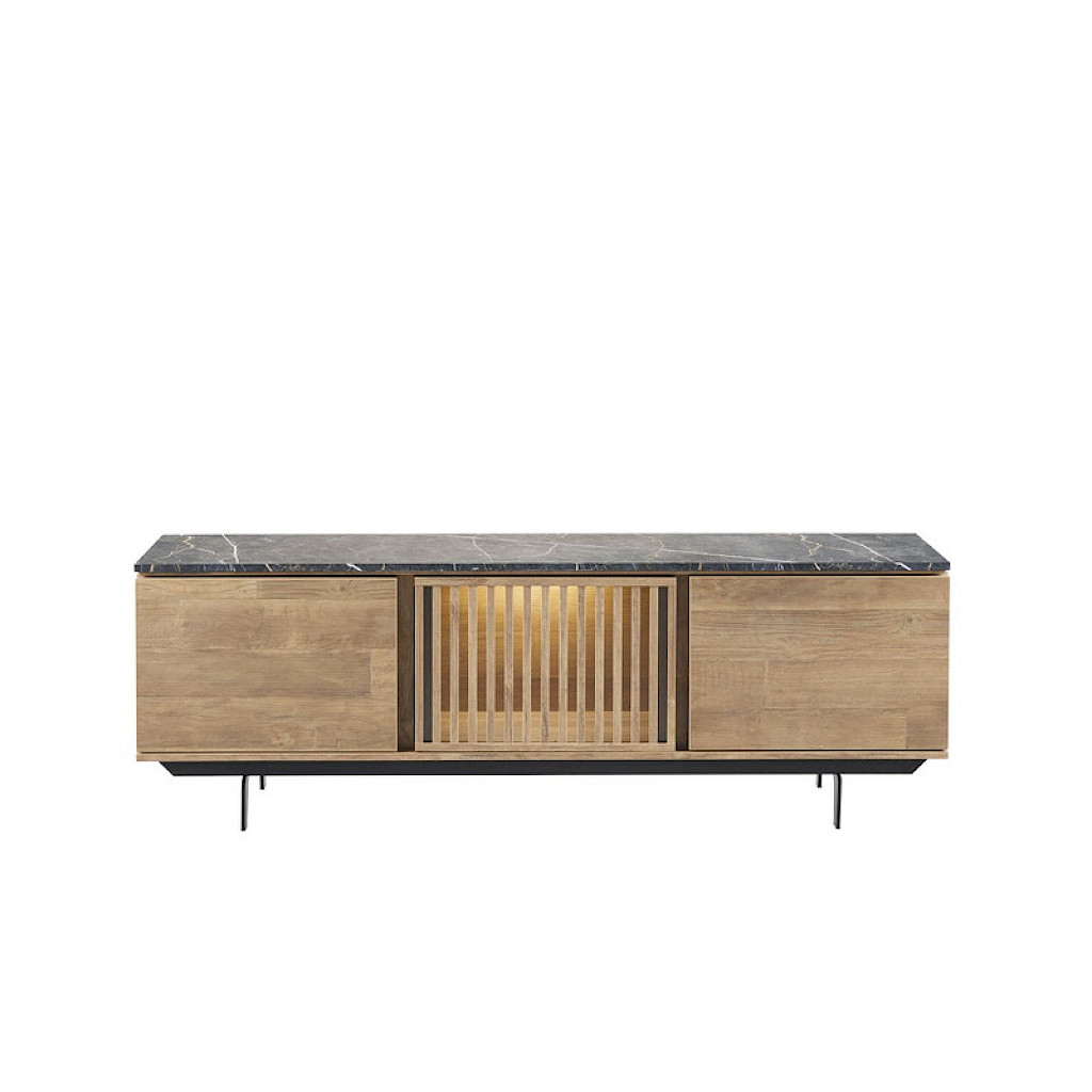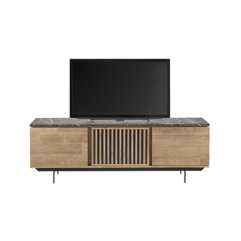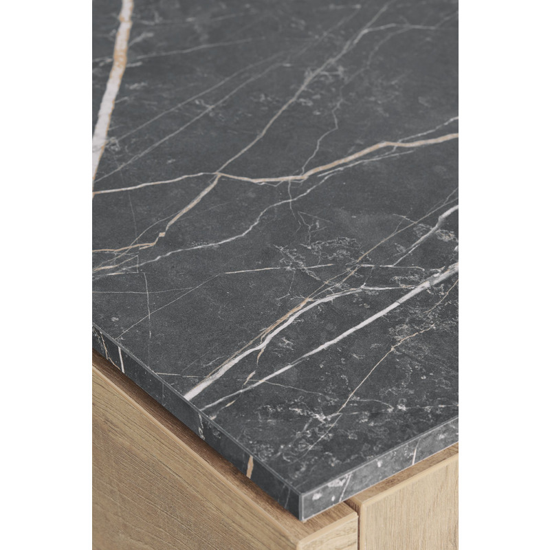 Dankzij de hoogwaardige melamine afwerking heeft het tv-meubel de uitstraling van echt hout, maar is het kras-, slijt- en stootvast en makkelijk in onderhoud. Het bovenblad is vervaardigd van hoogwaardig HPL (High-Pressure Laminate) materiaal, dat de uitstraling heeft van echt marmer. Dit geeft een luxueuze en chique uitstraling, terwijl het tegelijkertijd duurzaam en gemakkelijk te onderhouden is. Het heeft alle schoonheid en verfijning van echt marmer, maar zonder het hoge prijskaartje en de kwetsbaarheid.