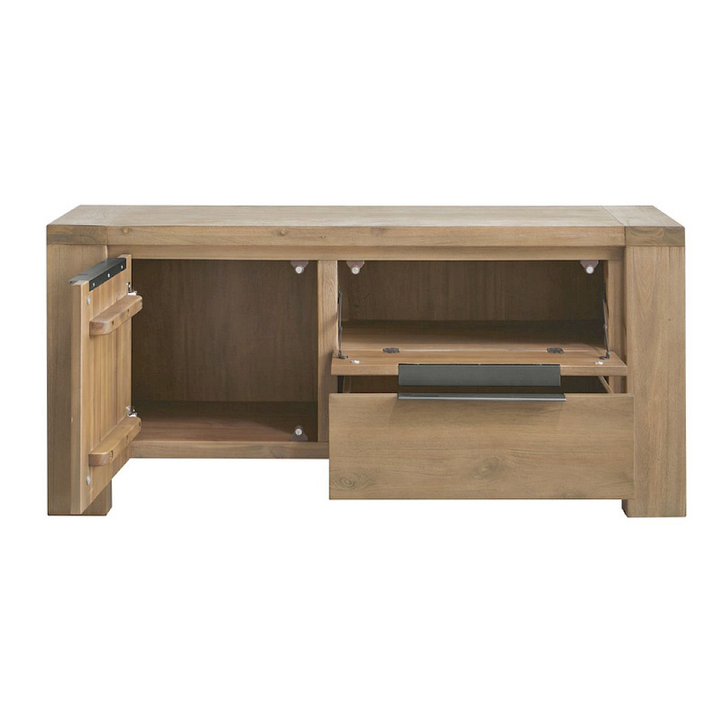 Tv-meubel Valvola geeft een warme, natuurlijke sfeer aan je interieur. Dit tv-meubel heeft 1 deur, 1 lade en 1 klep en is afgelakt met een beits en matglans lak in een warme, bruine kleur. De kast is 125 cm breed en 57 cm hoog. De lade is voorzien van een softclose systeem, waardoor deze automatisch zachtjes sluit. De deur en klep zijn uitgevoerd met een magneetsluiting. Daarnaast is het tv-meubel voorzien van een kabeldoorvoer. Deze zit achter de deurtjes en is afgedekt met een plaatje wat je kunt wegdraaien. De slanke, metalen handgrepen vallen mooi in de bovenkant van de frontjes en geven het tv-meubel een stijlvol, modern accent.