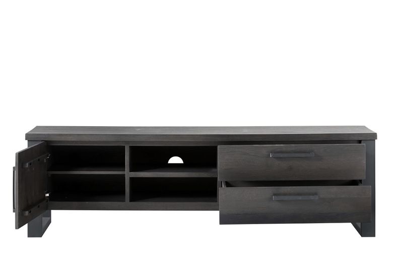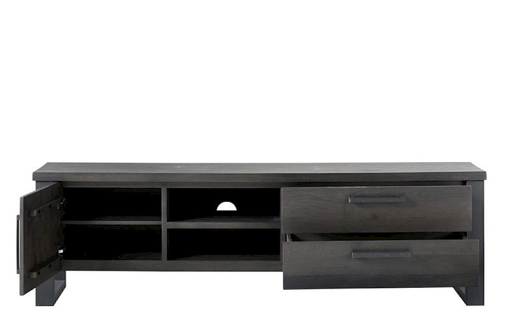 Dit industriële tv-meubel Verato is gemaakt van eikenhout met een metalen frame. Eikenhout kenmerkt zich door de fijne nerf, vlamtekening en de wisselende kleurschakering. Elke boom heeft een eigen uitstraling door de groei en weersinvloeden. Structuur, nerfschakering, windbarstjes, haarscheurtjes en de aanwezigheid van grote en kleine knoesten getuigen van jarenlange groei en maken het hout van de boom authentiek.