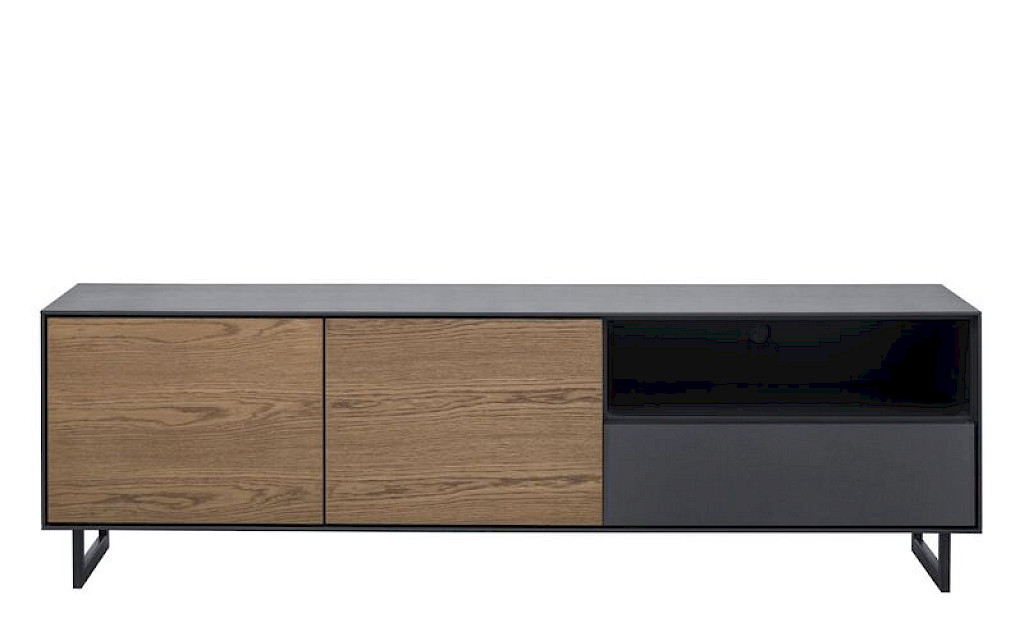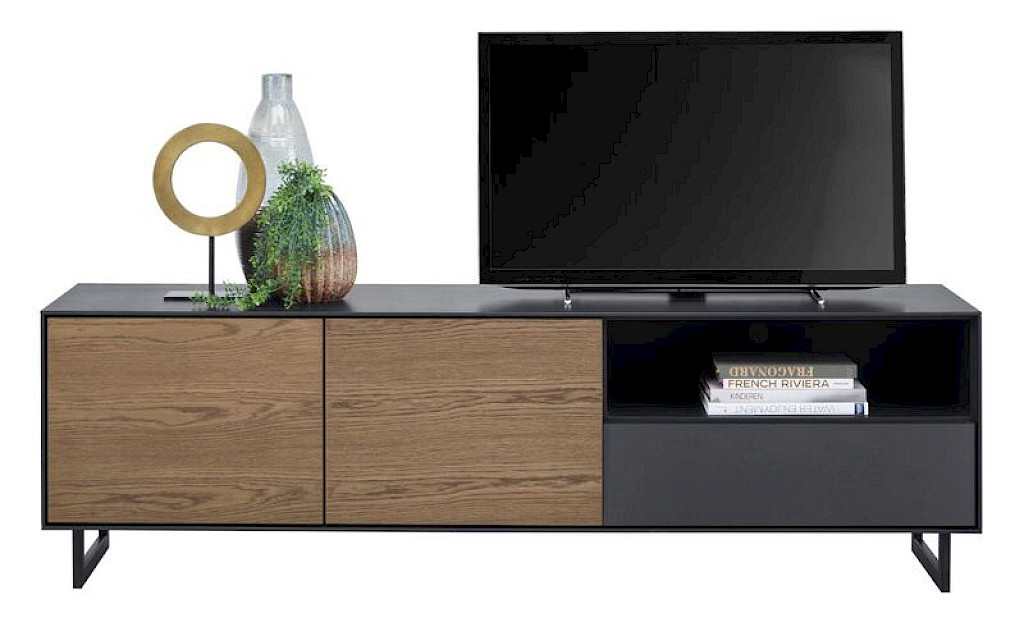 Uitgevoerd met korpus in MDF zwart structuurlak in combinatie met 2 deuren in eiken fineer in de kleur kasteelbruin en 1 lade in zwart structuur, met 1 open vak en zwarte metalen U-poten.
