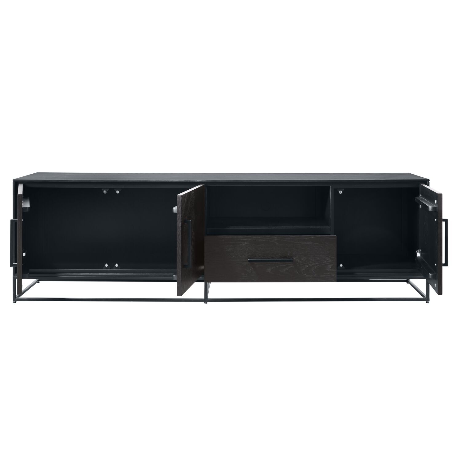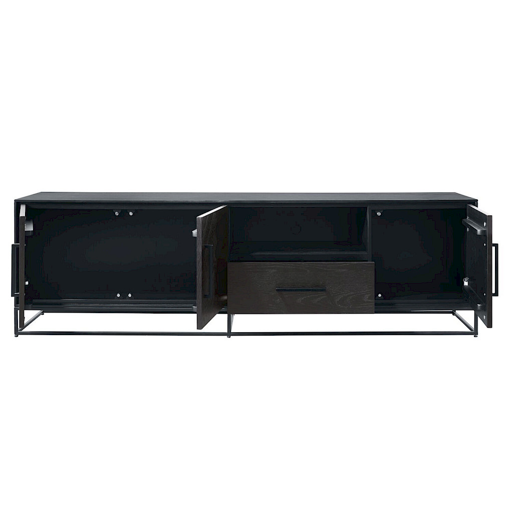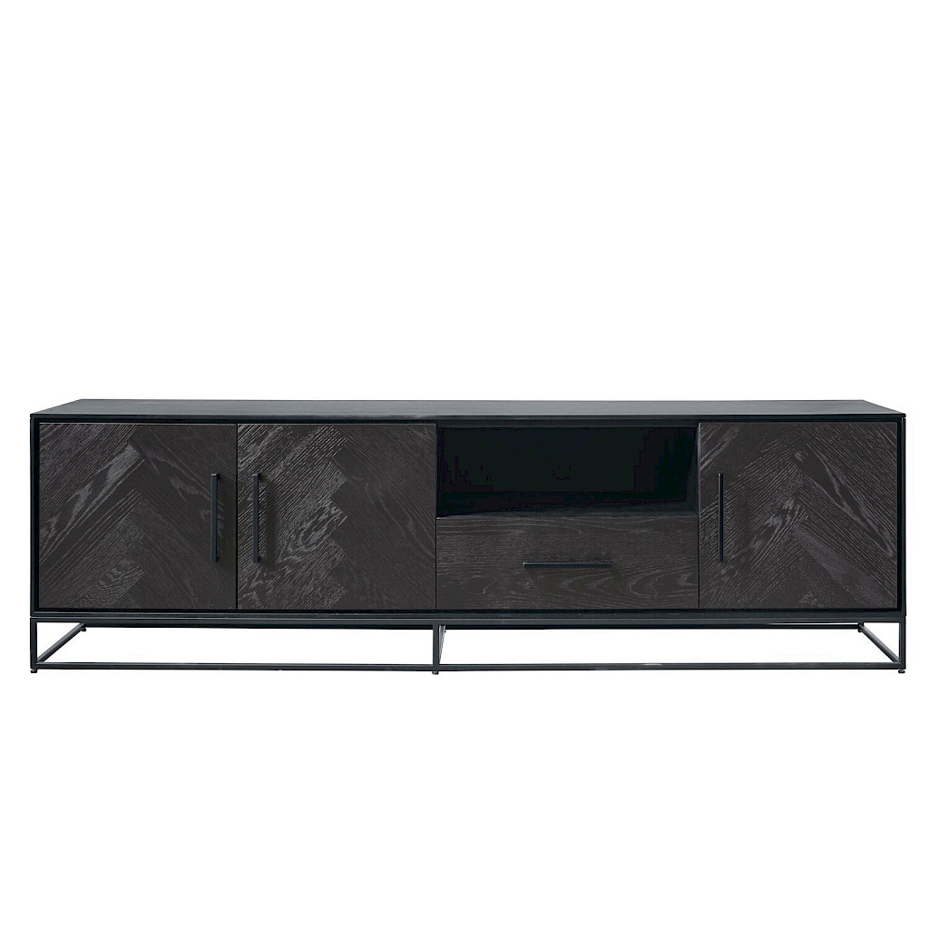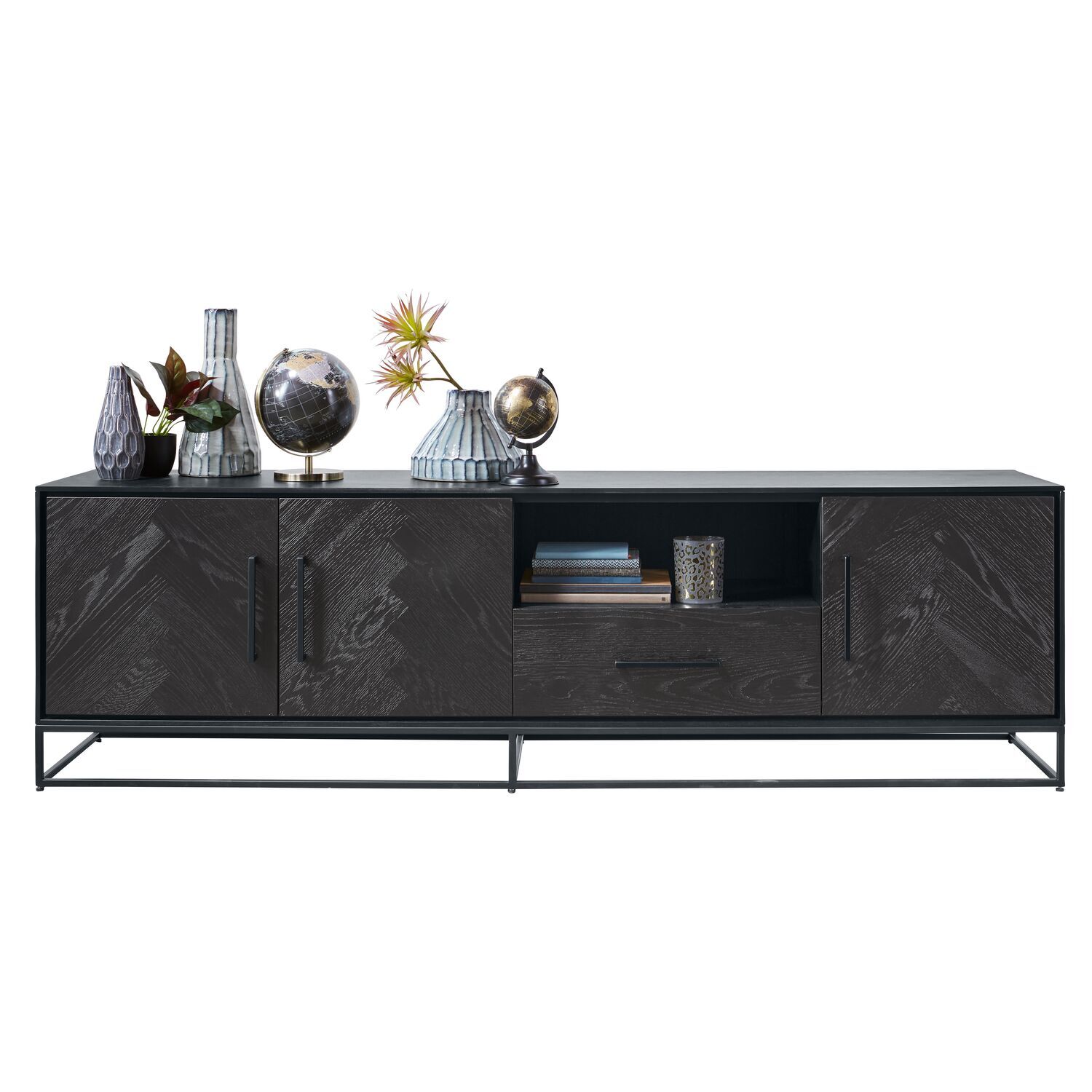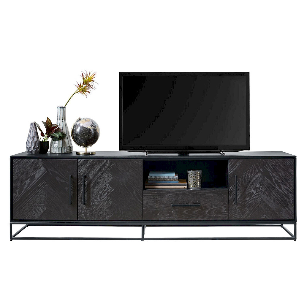 Zwart eiken TV-Meubel met zwarte romp en zwarte metalen poten. Het beschikt over 3 deuren met visgraat motief, 1 lade (met soft-close systeem) en 1 open vak. Het open vak is H21xB60xD38 groot en is al voorzien van een ronde opening voor de kabeldoorvoer. De totale afmetingen zijn H58xB199xD40cm. Het TV-Meubel wordt gemonteerd geleverd en is daarnaast leverbaar in kleinere maten of in de kleur naturel.