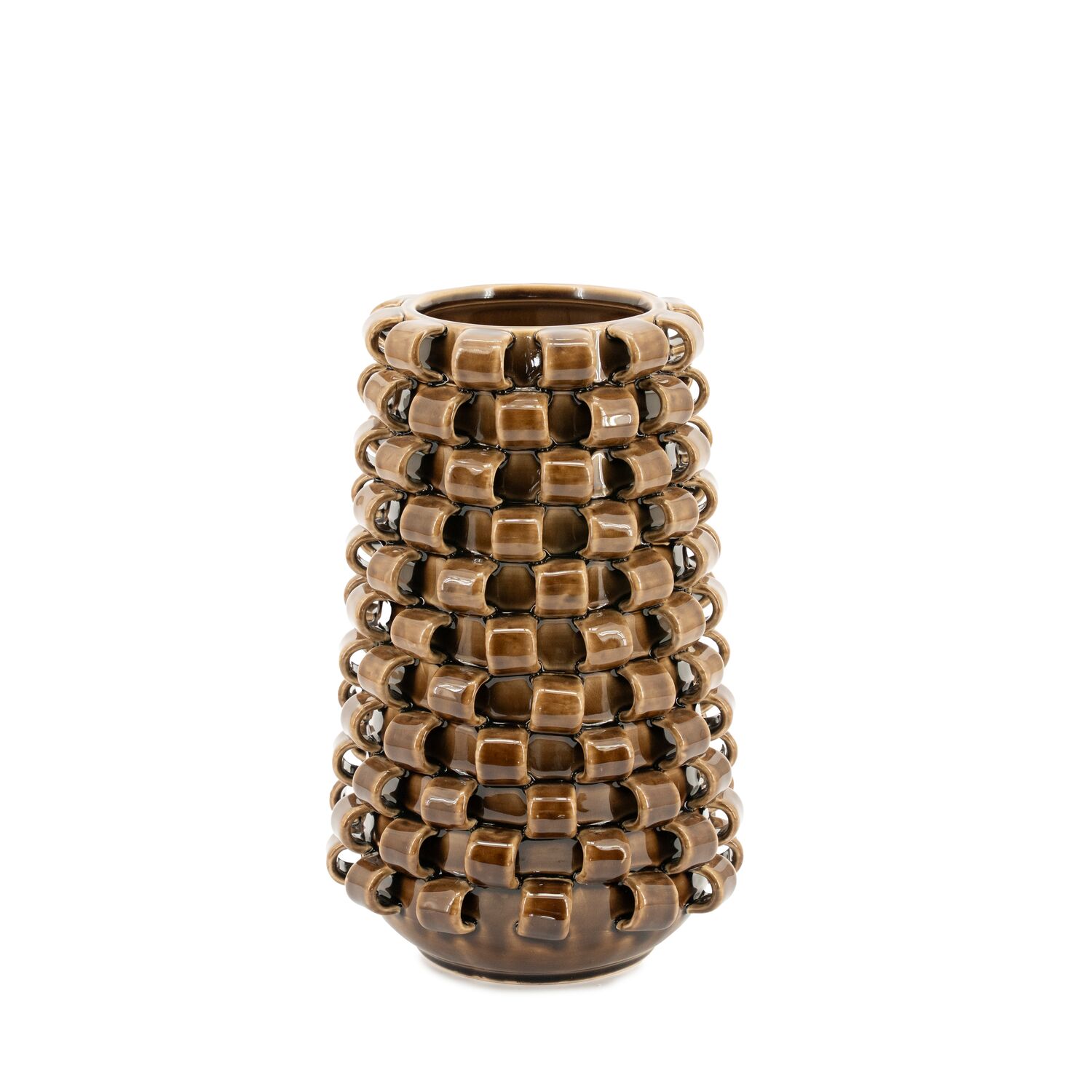 Geglazuurd aardewerk uitgevoerd in de kleur bruin. Handgemaakt. Kleurverschillen en onregelmatigheden in de glazuring maken deel uit van het fabricageproces