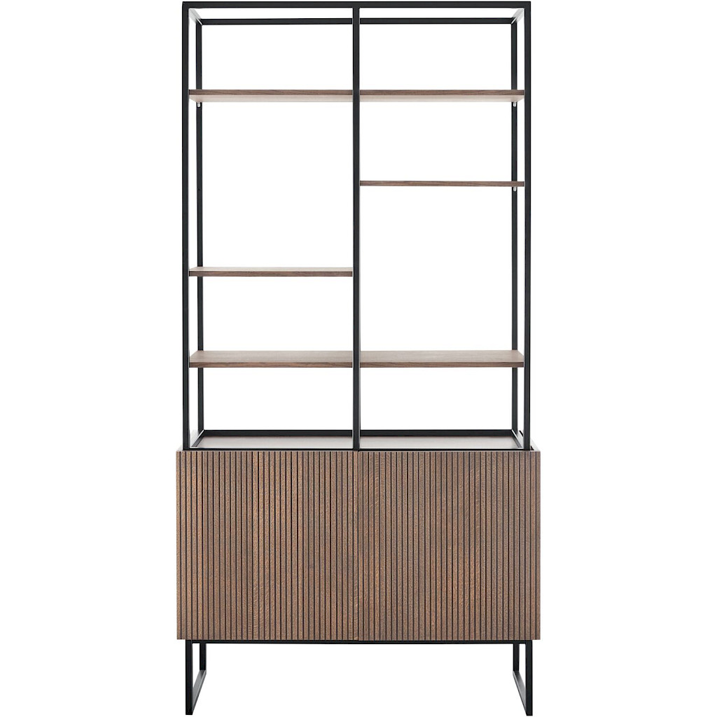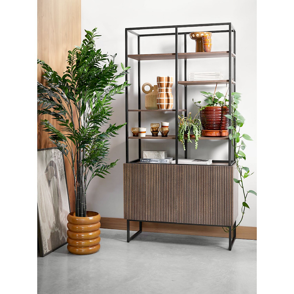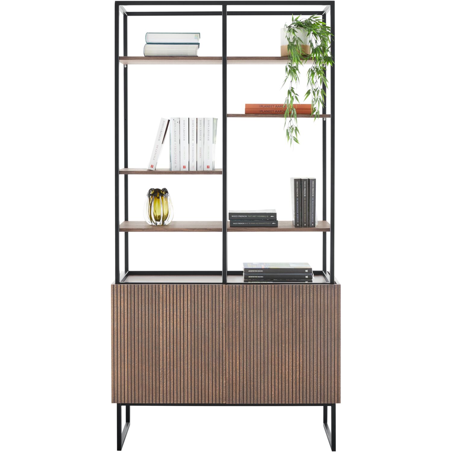 Vakkenkast Marandi small is onderdeel van een stoer en tijdloos woonprogramma. Deze vakkenkast bestaat uit een dressoir in bruin eiken fineer met 2 deuren en een opzetrek met 4 houten legplanken. Het zwarte metalen opzetrek en de zwart metalen poten in combinatie met de mooie geribbelde structuur geven model Marandi een licht industriële look. De 2 deuren van het dressoir zijn voorzien van een push-to-open en soft-close systeem.