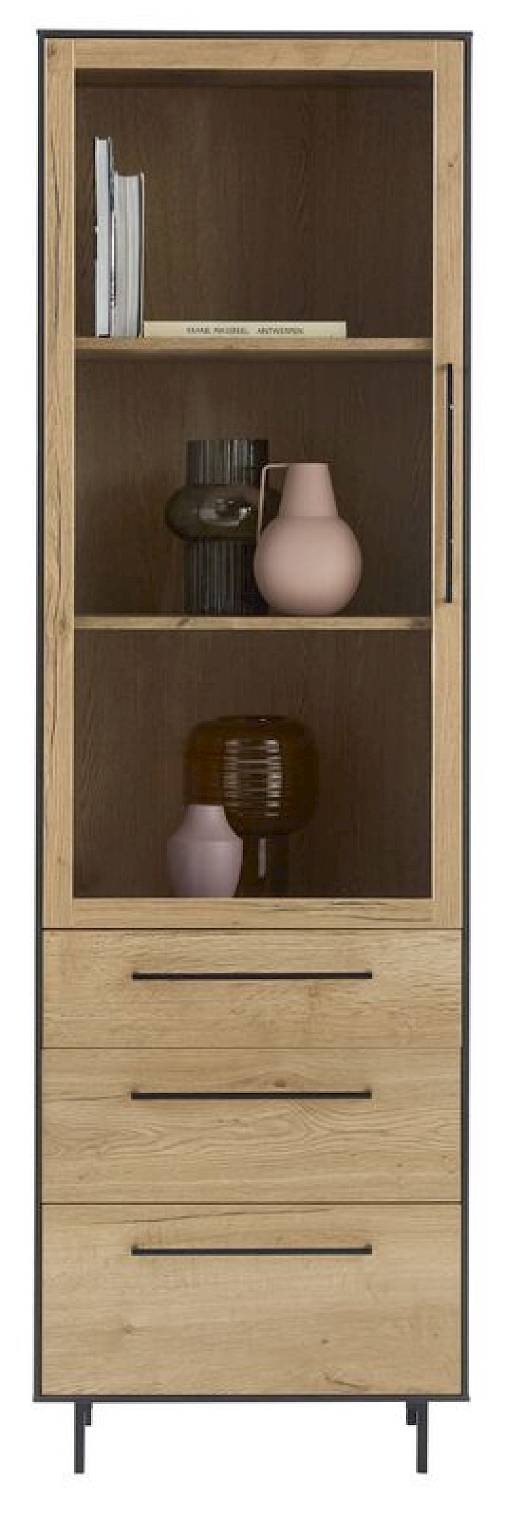 Deze vitrinekast heeft 1 glasdeur en 3 laden. Achter de glasdeur zijn 2 legplanken waarop je je accessoires zichtbaar kunt tonen.