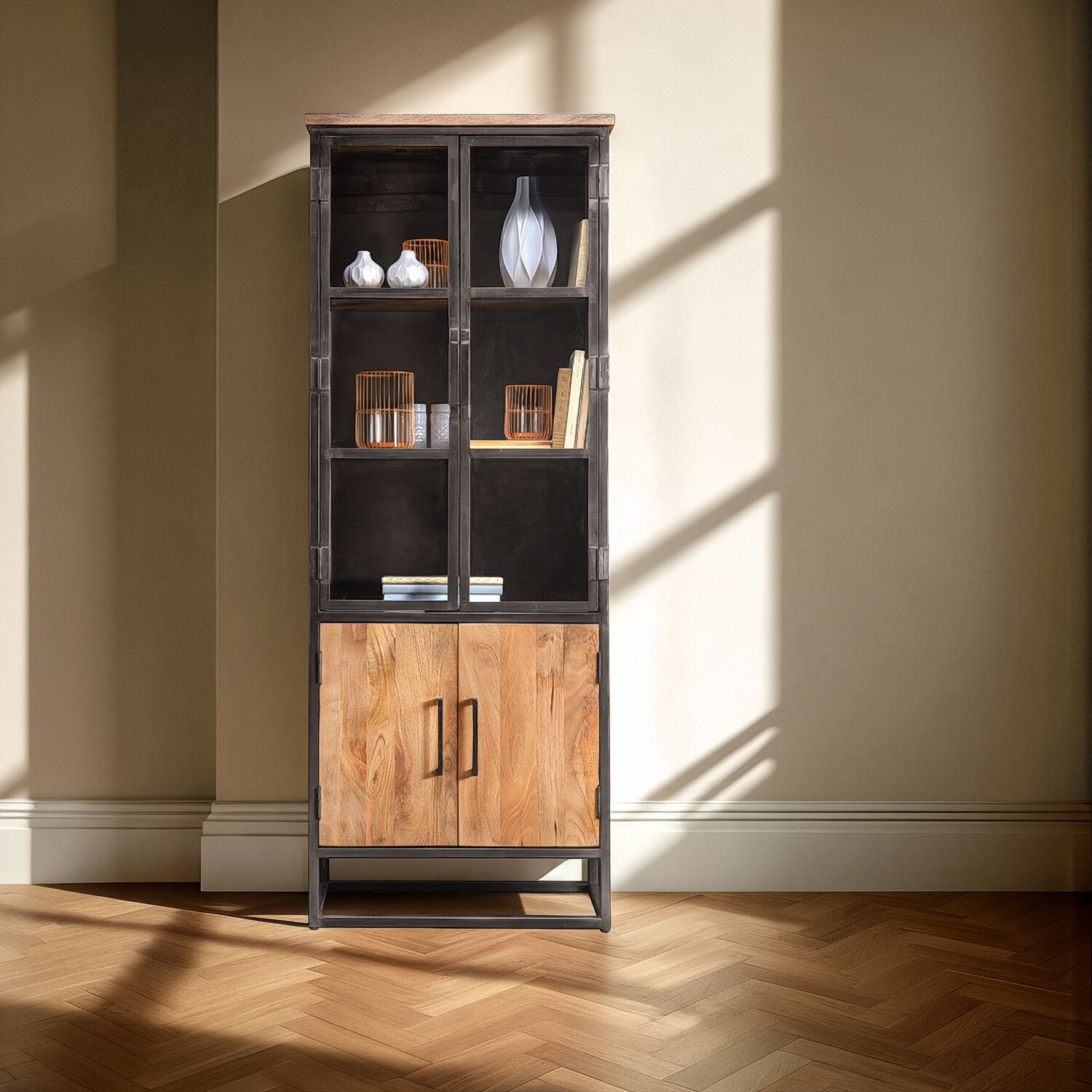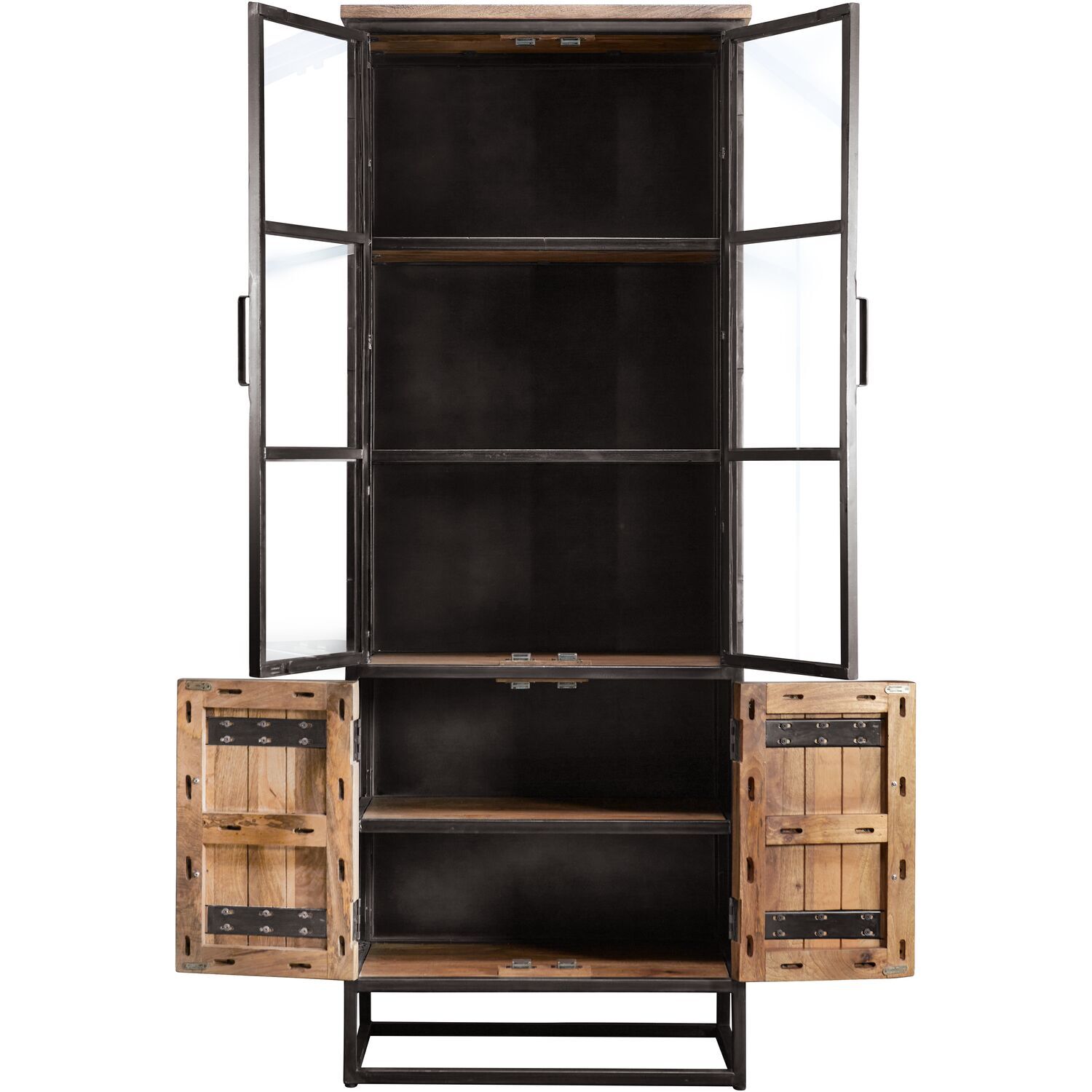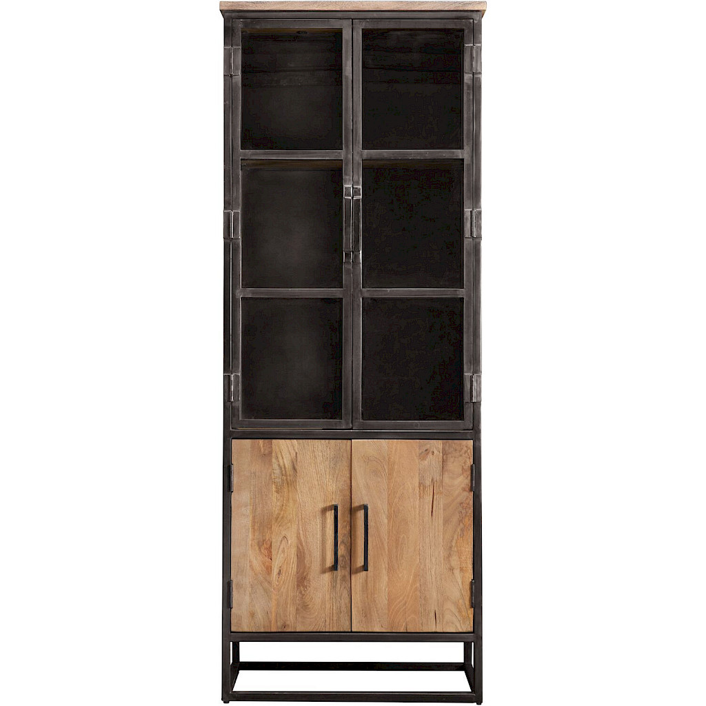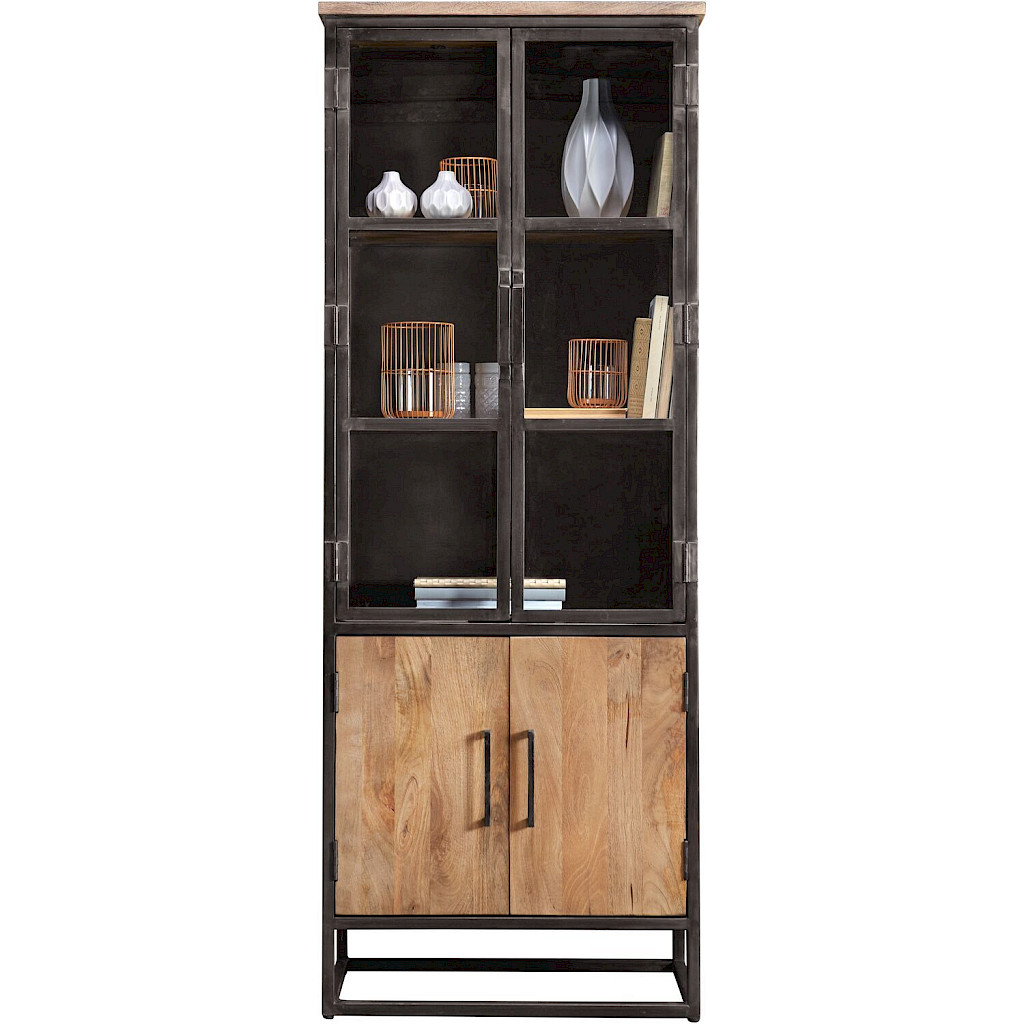 Vitrinekast Mesola is een trendy kast met een industriële uitstraling. De warme, lichtbruine kleur en het metalen frame zorgen voor een unieke sfeer in je woonkamer. Deze robuuste kast is gemaakt van massief mangohout. Dit hout heeft een natuurlijke uitstraling met verschillende lijnen, nerven en kleurschakeringen. Hierdoor is ieder meubel uniek. Het hout is afgewerkt met een transparante lak, zodat er niet snel vlekken op ontstaan en het onderhoud eenvoudig is.