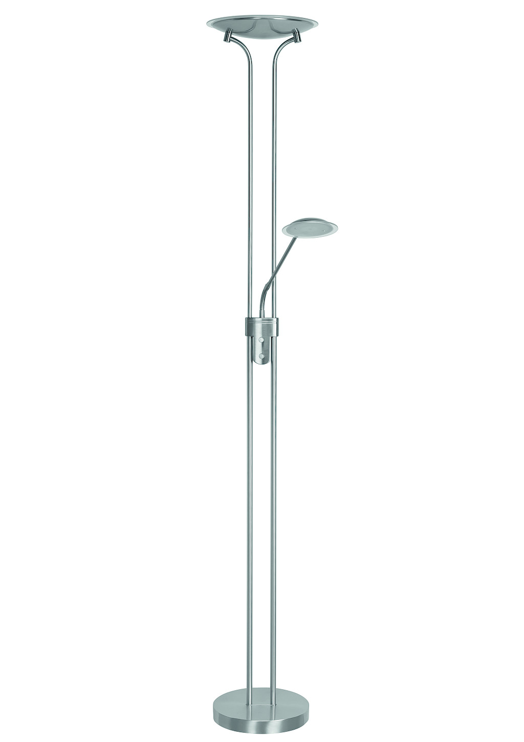 Vloerlamp Strato nikkel met spot en Ø 28 cm. Deze lamp wordt compleet geleverd met lichtbron(nen). Als lichtbron kan alleen een LED lamp worden gebruikt. Incl. 2 dimmers.