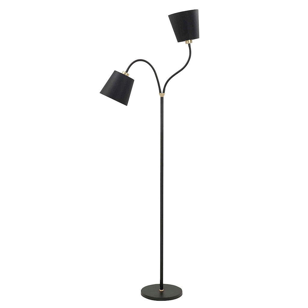 Leuke vloerlamp van Highlight met een knipoog naar de jaren 70. Bij deze dubbele vloerlamp zijn de armen flexible en elke arm heeft een aparte schakelaar bij de fitting net boven de kappen. De kappen zijn gemaakt van zwarte stof en de binnen kant van de kappen zijn mat-goud van kleur. De vloerlamp zelf is ook zwart met mat-gouden accenten.