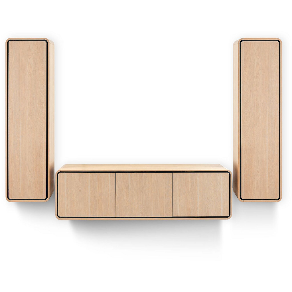 Wandkast Lagoria is onderdeel van een woonprogramma en heeft een strakke en moderne uitstraling. Deze wandkast bestaat uit 1x hangend TV-meubel met 3 deuren en 2x hangende opbergkast met 1 deur. De prachtige afgeronde vormgeving en het subtiele zwarte randje rondom de deurtjes springen direct in het oog. Dankzij de Melamine afwerking in Brushed sand oak nature heeft Lagoria de uitstraling van echt hout, maar is zeer kras-, slijt- en stootvast en makkelijk in onderhoud.