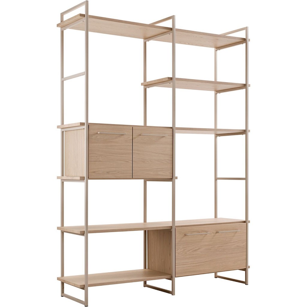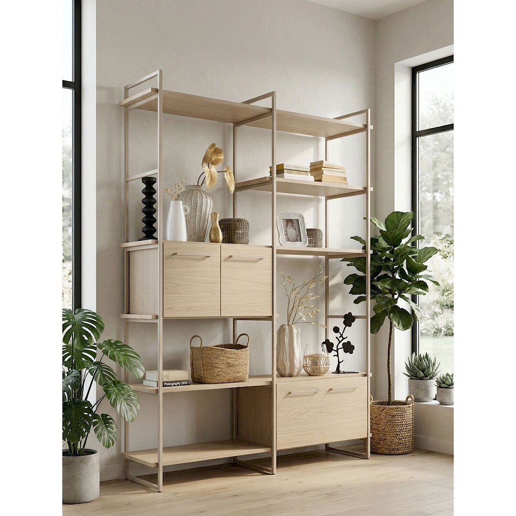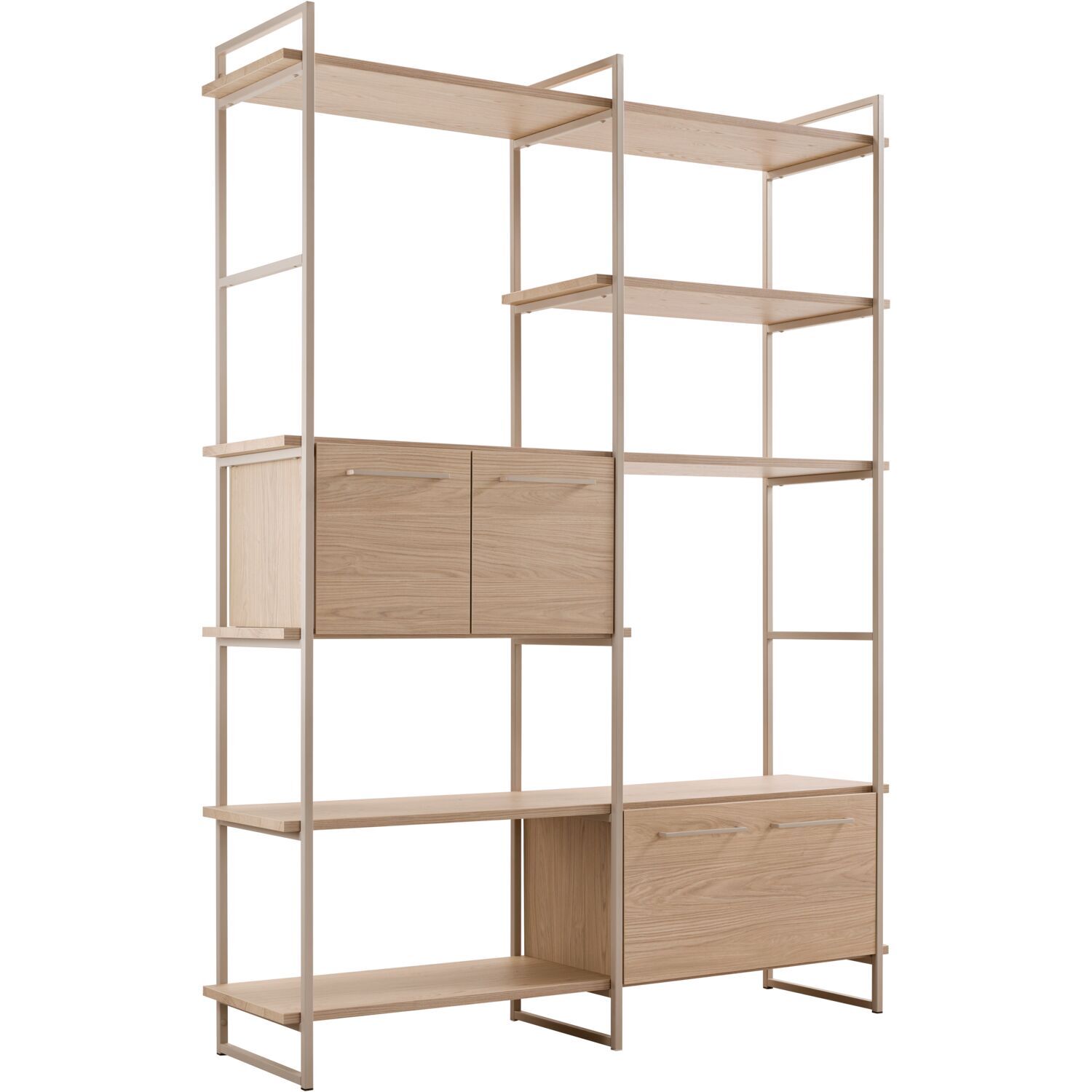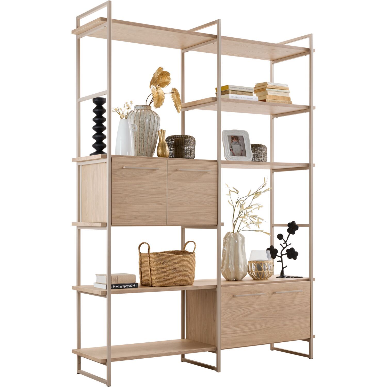 Deze kast combineert een metalen frame in de kleur stone grey met chique accenten in het lichtbruine houtdecor misty oak, wat zorgt voor een warme en eigentijdse Japandi uitstraling.