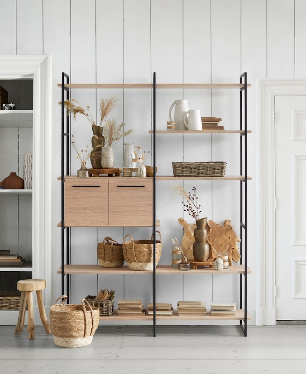 Basis opstelling 3: 1x set van 3 zwart metalen staanders, 2x set van 2 legplanken 166 cm, 1x set van 2 legplanken 88 cm. + inzetkast 2 deuren laag misty oak decor
