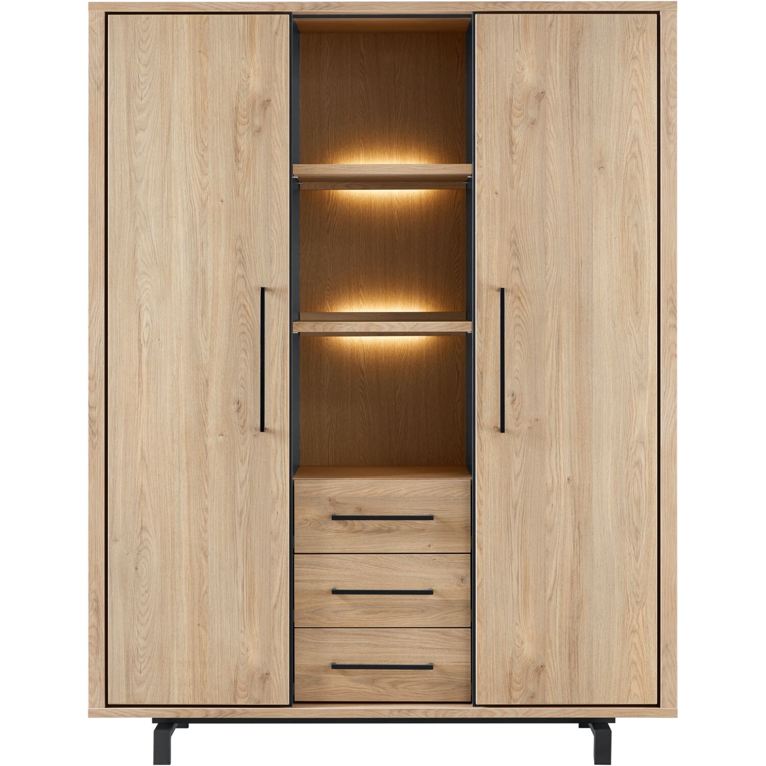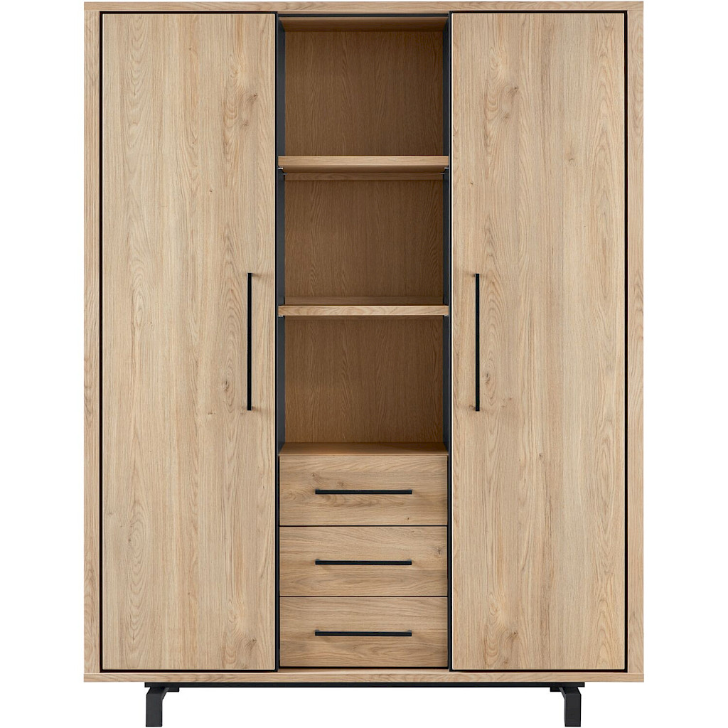Wandkast Wesara is onderdeel van een kastenserie met een tijdloze uitstraling. Deze kast is voorzien van 2 deurtjes, 3 laden, 3 open vakken en zwart metalen pootjes die zorgen voor een zwevende look. Dankzij de onderhoudsvriendelijke Lamulux afwerking, geniet je van de warme uitstraling van echt hout zonder in te leveren op gebruiksgemak.