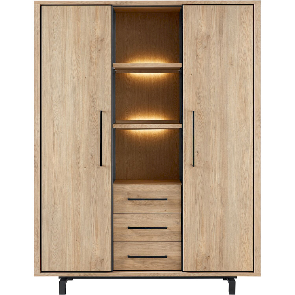 Wandkast Wesara is 135 cm breed en 175 cm hoog. De deurtjes en laden zijn voorzien van zwarte handgrepen en de open vakken kunnen tegen meerprijs voorzien worden van LED-verlichting. Omdat deze kast onderdeel is van een kastenserie, is hij goed te combineren met andere meubels uit dit woonprogramma. Vraag naar de mogelijkheden in de winkel.