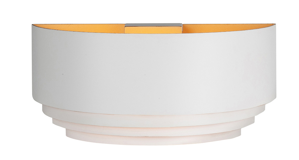 Wandlamp Elena wit + goud met 1 lichtpunt en Ø 12 cm. Deze lamp wordt geleverd zonder lichtbron(nen). Als lichtbron kan zowel een gloei- als LED lamp worden gebruikt. Dimbaar via externe dimmer.