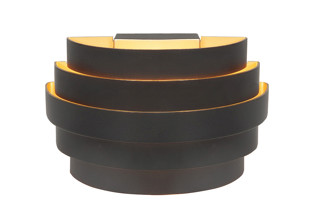 Wandlamp Scudo zwart + goud met 1 lichtpunt . Deze lamp wordt geleverd zonder lichtbron(nen). Als lichtbron kan zowel een gloei- als LED lamp worden gebruikt. Dimbaar via externe dimmer.