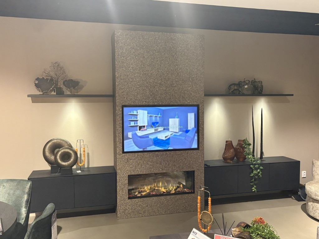 Uitgevoerd met 2 boekenplanken en LED spots, 1 hangmeubel 2 deurs, 1 hangmeubel 3 deurs, Zense ombouw met haard Vivente 100 en nis tbv tv-scherm. Excl. montage.