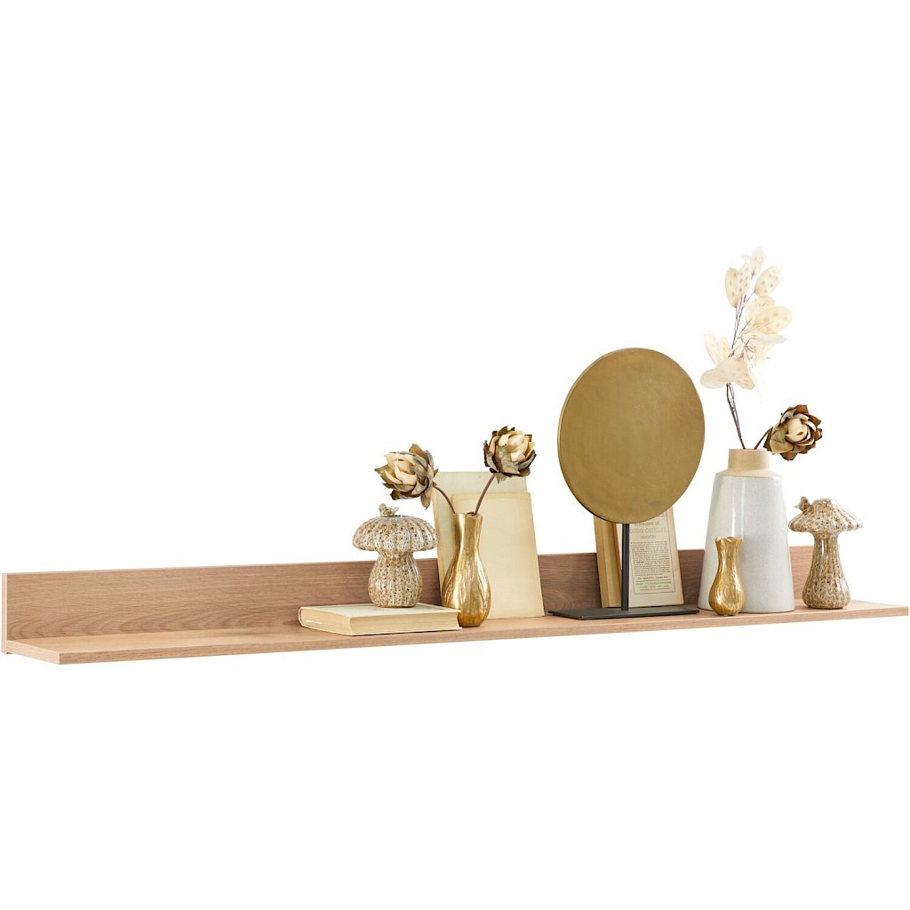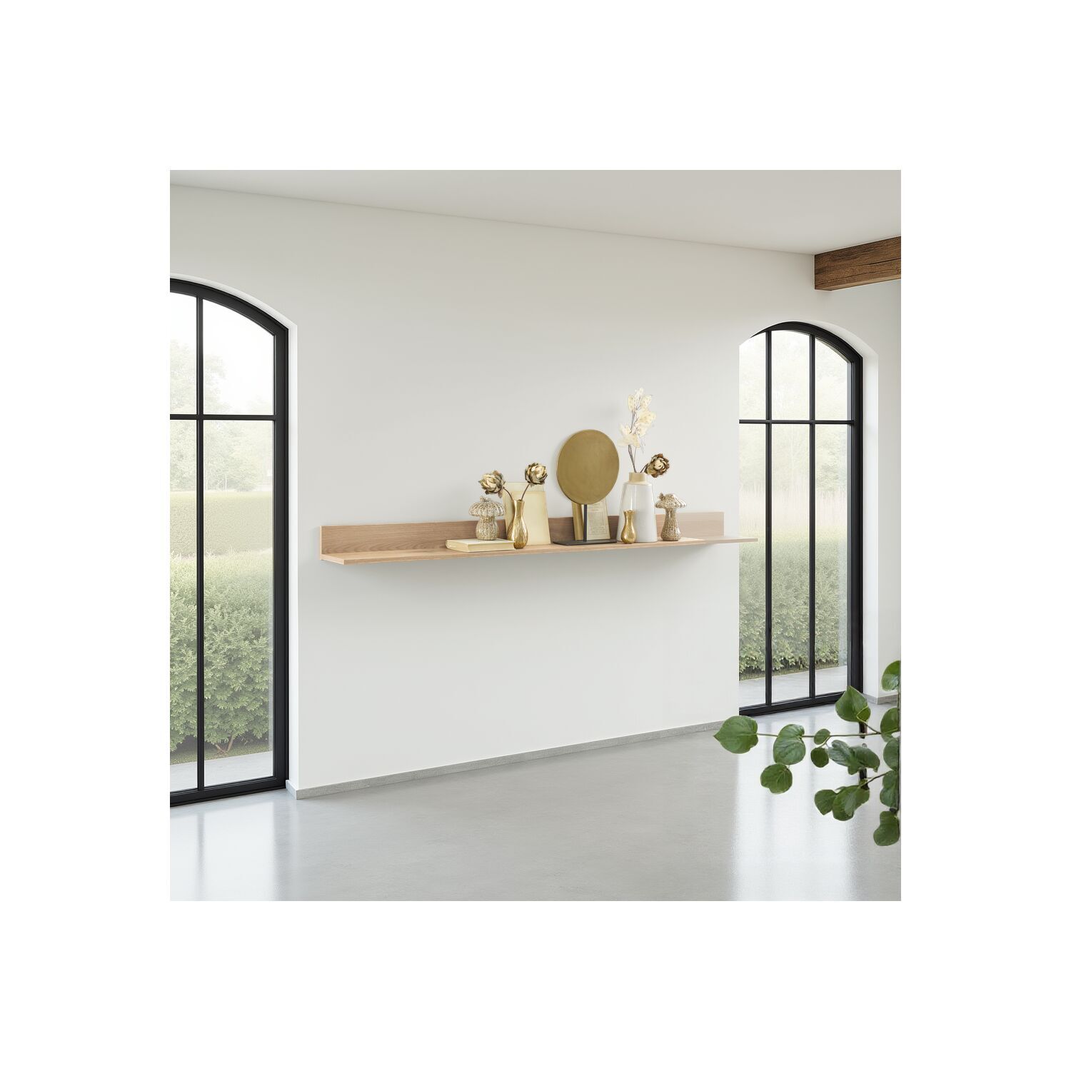 Met een breedte van 165 cm, hoogte van 12 cm en diepte van 21 cm is deze wandplank ideaal voor het tonen van boeken, foto’s of decoratieve items. De strakke vormgeving en warme kleur maken het een subtiele, maar stijlvolle aanvulling in je interieur.